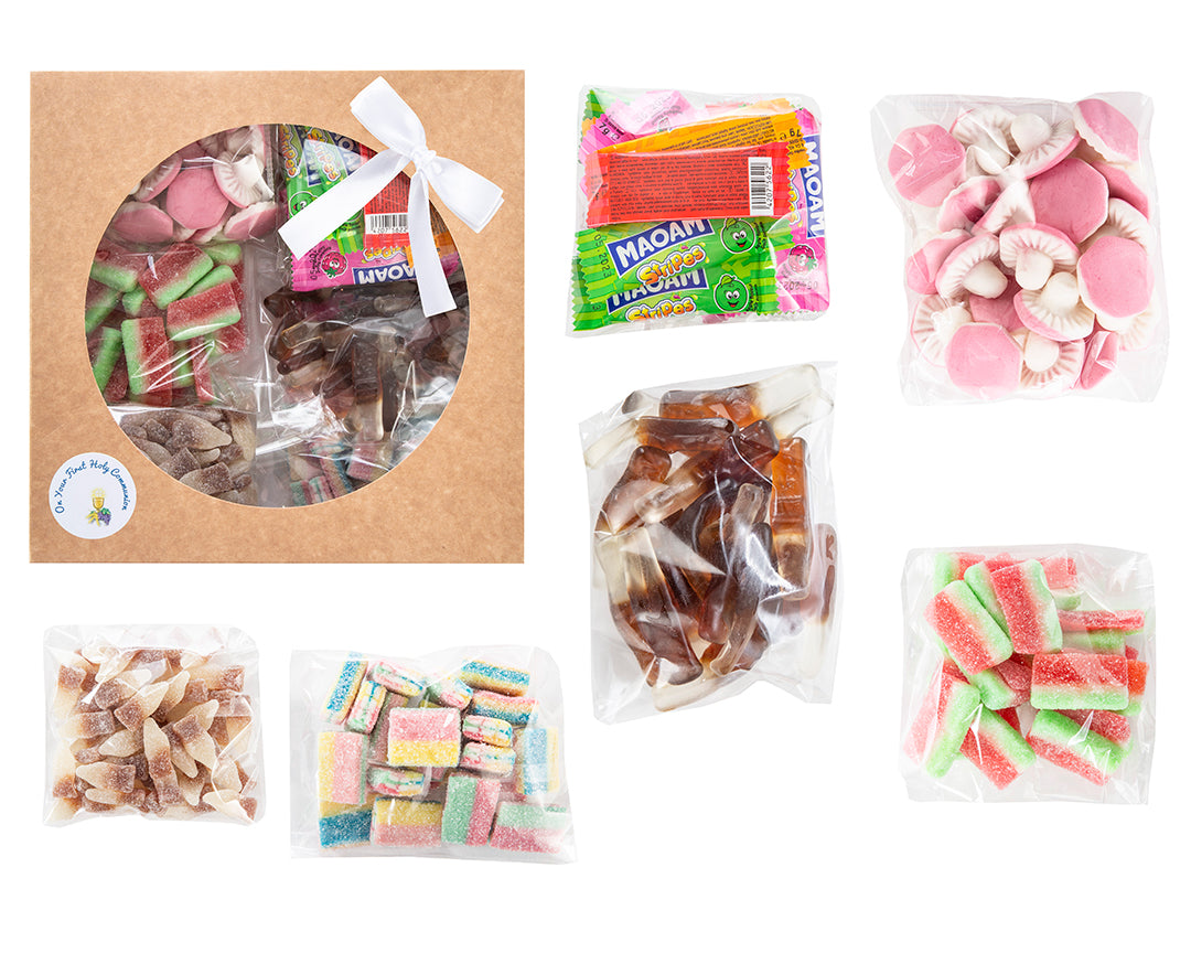The box contains a selection of 6 packets of mixed sweets, fizzy and non-fizzy. Each packet weighs 100g.